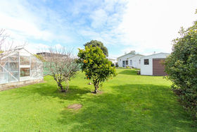 The backyard is fully fenced with a number of fruit trees and a glass house for those with green fingers.
