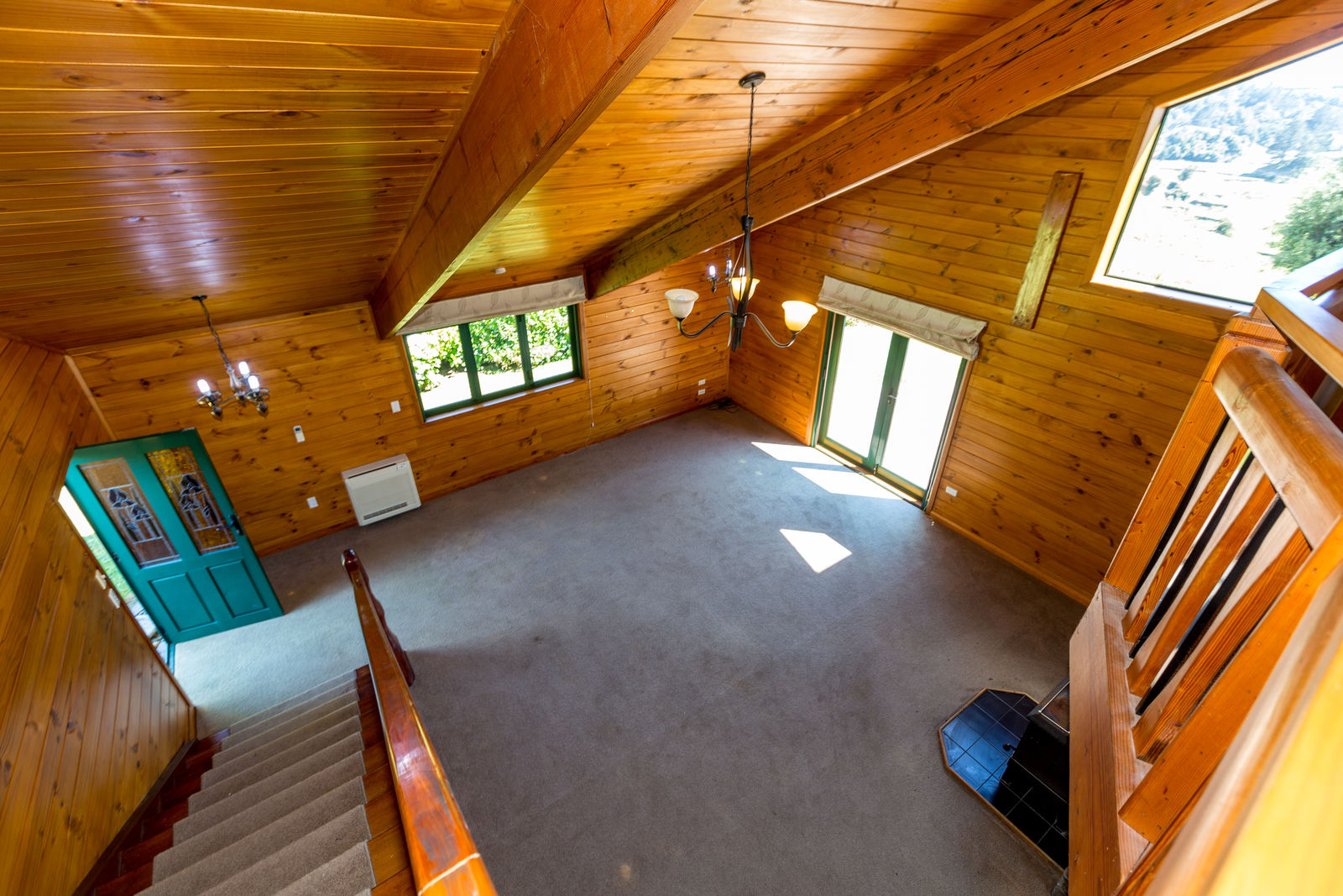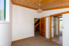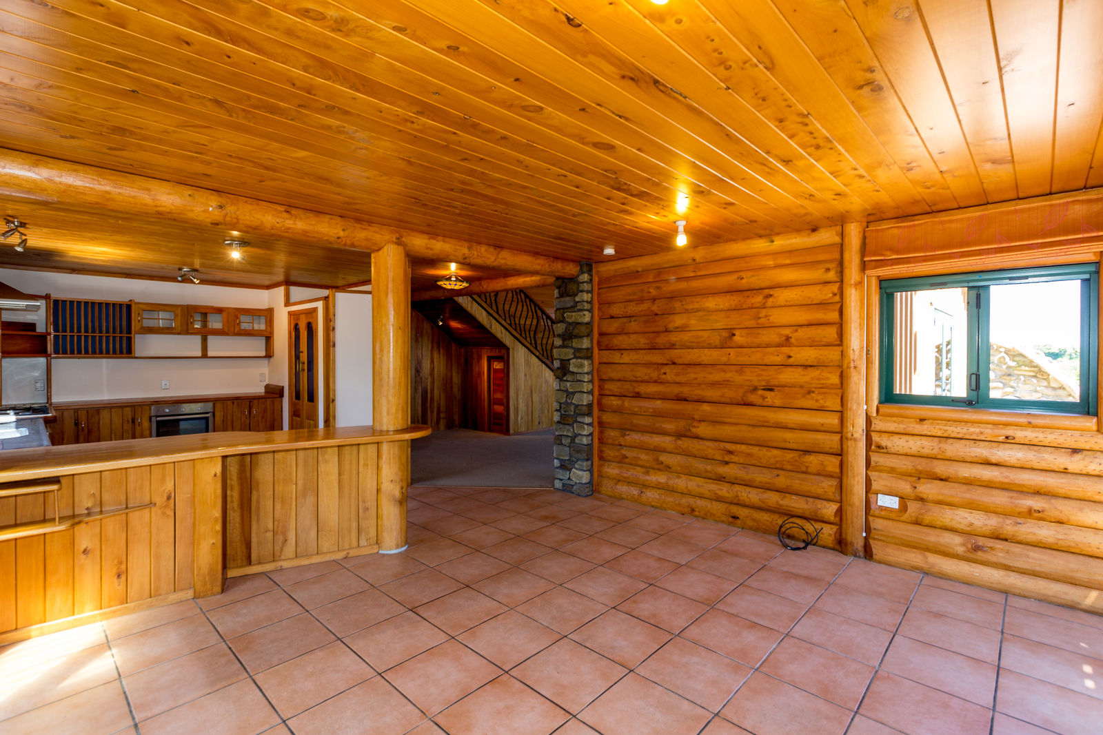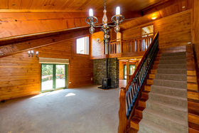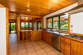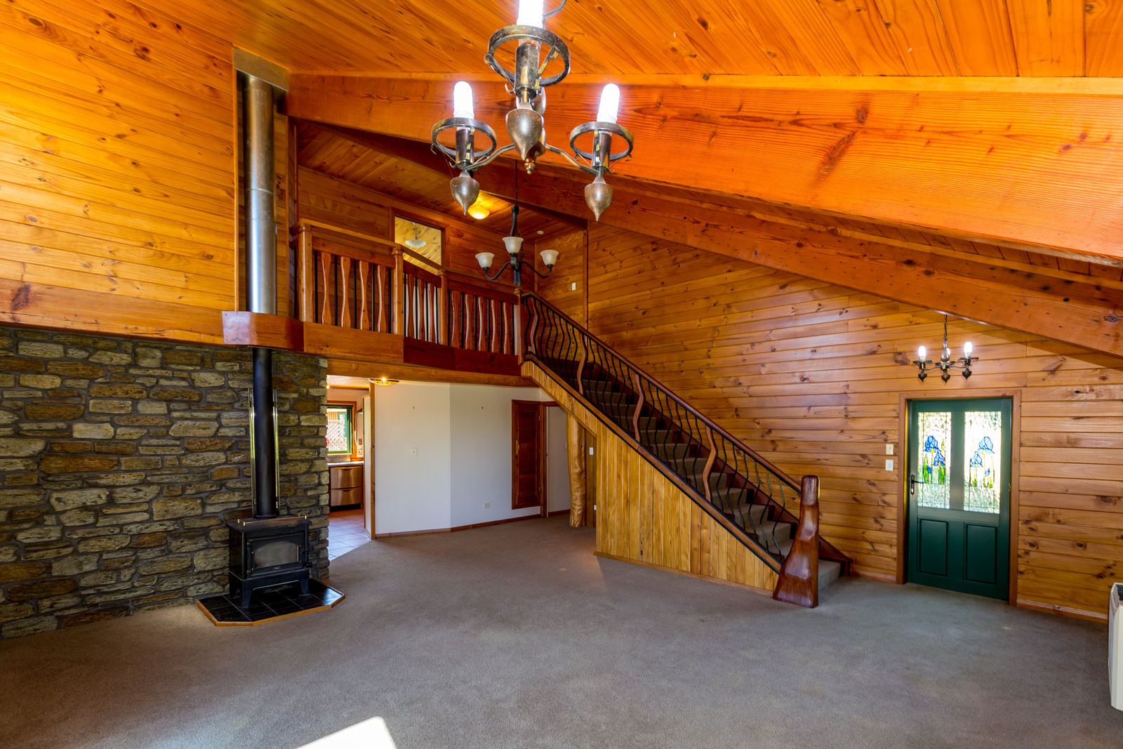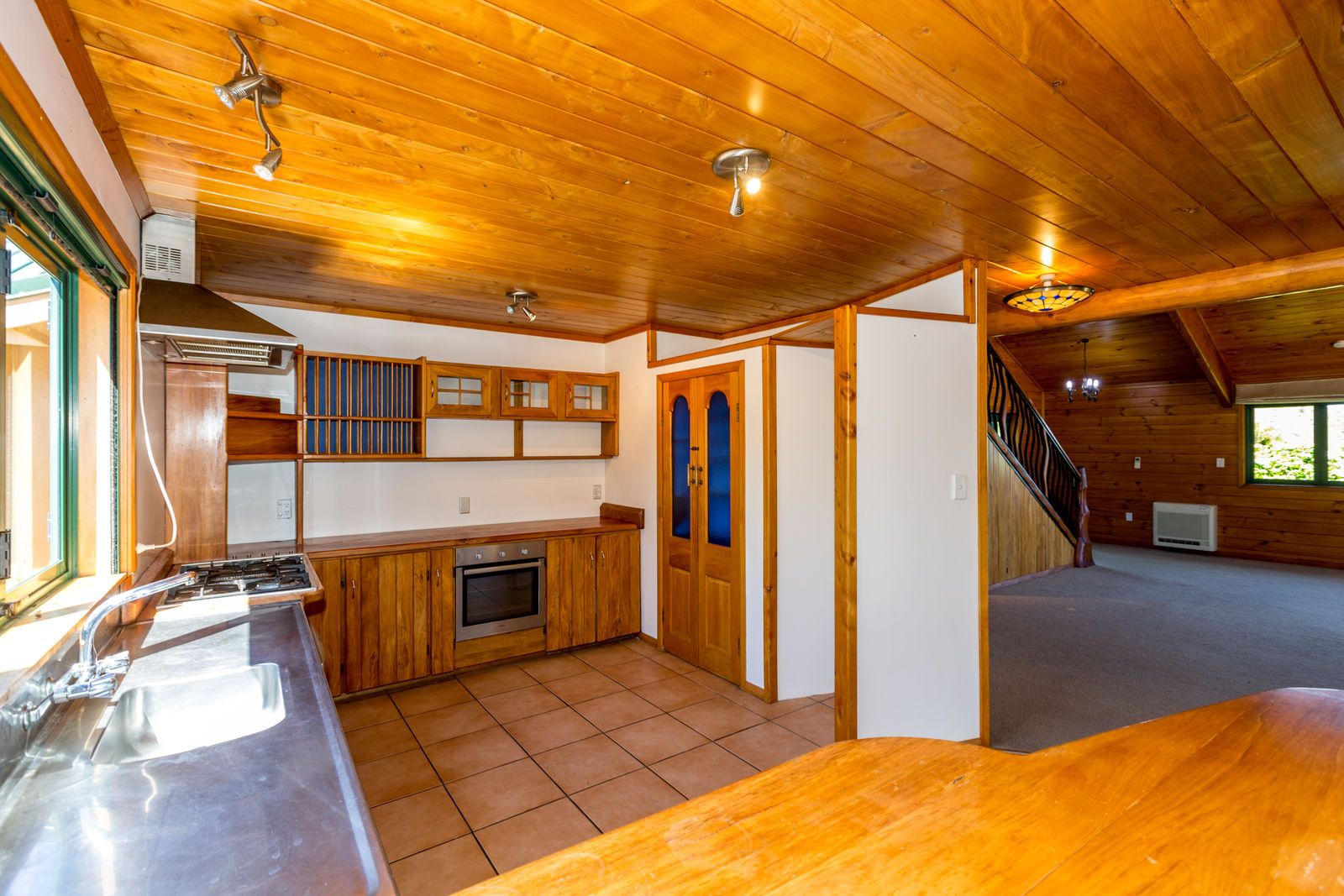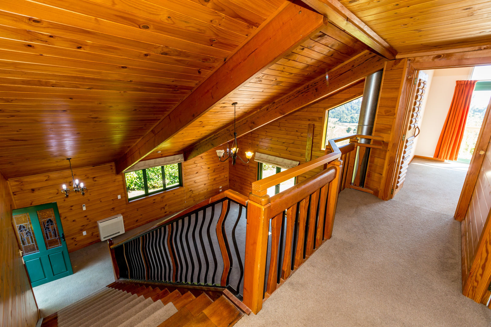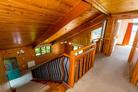 The home, with all its timber finishing, has an impressive staircase leading to the master bedroom and office. Downstairs are three more bedrooms with an open plan kitchen/dining and the lounge straight off that.